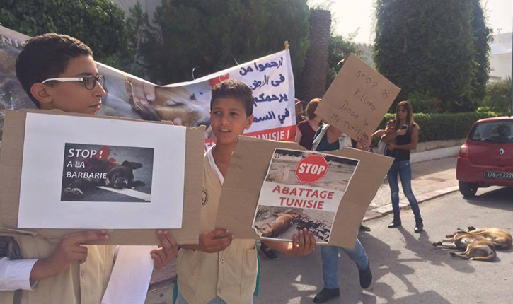 وحمل المتظاهرون لافتات كتب عليها “لا لقتل الكلاب في تونس”” قتل الكلاب في تونس عمل بريري وغير انساني”.