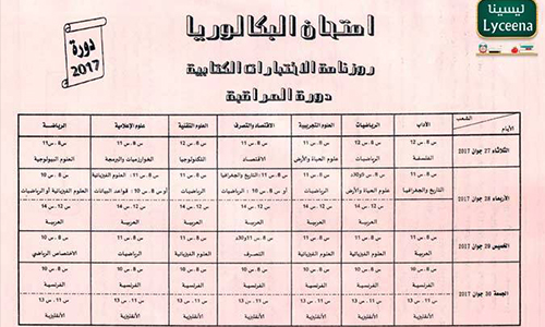 و يشار الى ان  الدورة الرئيسية للباكالوريا تنطلق يوم الأربعاء 7 جوان وتتواصل إلى غاية يوم الأربعاء 14 جوان 2017،و  دورة المراقبة تنطلق  يوم الثلاثاء 27 جوان وتنتهي يوم الجمعة 30 جوان الجاري .