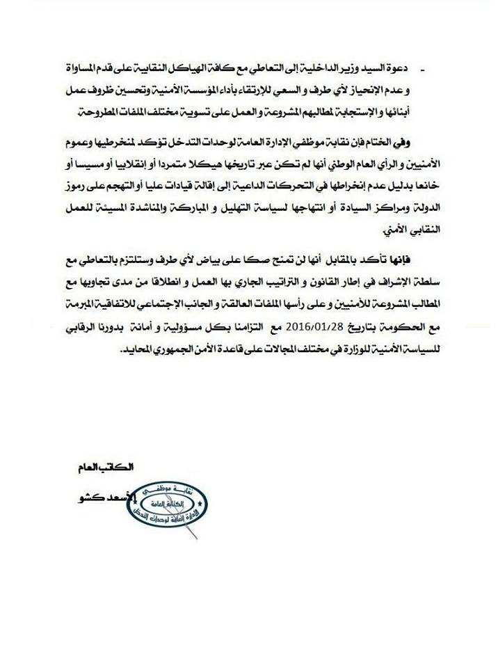 واضافت النقابة أنها لن تمنح صكا على بياض لأي طرف وستلتزم بالتعاطي مع سلطة الإشراف في إطار القانون و التراتيب الجاري بها العمل و انطلاقا من مدى تجاوبها مع المطالب المشروعة للأمنيين و على رأسها الملفات العالقة و الجانب الإجتماعي للاتفاقية المبرمة مع الحكومة بتاريخ 28/01/2016 مع التزامنا بكل مسؤولية و أمانة بدورنا الرقابي للسياسة الأمنية للوزارة في مختلف المجالات على قاعدة الأمن الجمهوري المحايد.
