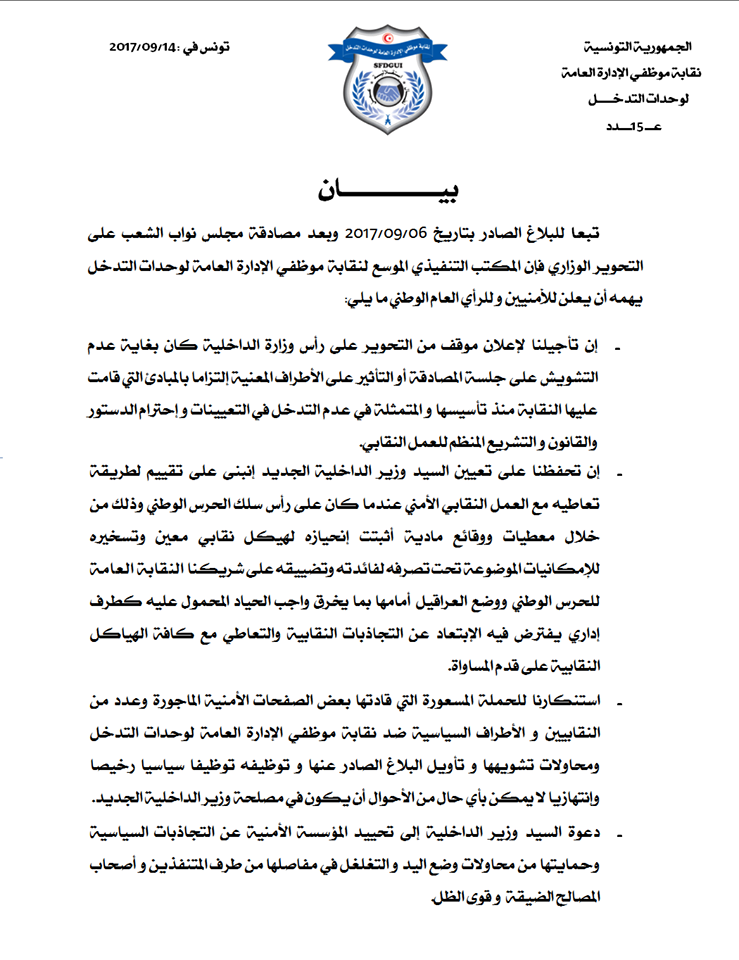 وقد جاء في البلاغ ان تحفظ النقابة  على تعيين  وزير الداخلية الجديد” إنبنى على تقييم لطريقة تعاطيه مع العمل النقابي الأمني عندما كان على رأس سلك الحرس الوطني وذلك من خلال معطيات ووقائع مادية أثبتت إنحيازه لهيكل نقابي معين وتسخيره للإمكانيات الموضوعة تحت تصرفه لفائدته وتضييقه على شريكنا النقابة العامة للحرس الوطني ووضع العراقيل أمامها بما يخرق واجب الحياد المحمول عليه كطرف إداري يفترض فيه الإبتعاد عن التجاذبات النقابية والتعاطي مع كافة الهياكل النقابية على قدم المساواة.”