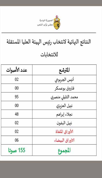 حيث لم يتحصّل ايّ مترشّح على عدد الأصوات المطلوب (109) وسوف يتمّ مواصلة التصويت على إنتخاب رئيس للهيئة العليا المستقلة للإنتخابات في دورة ثانية من ضمن المترشّحين المتحصّلين على أعلى عدد من الأصوات.