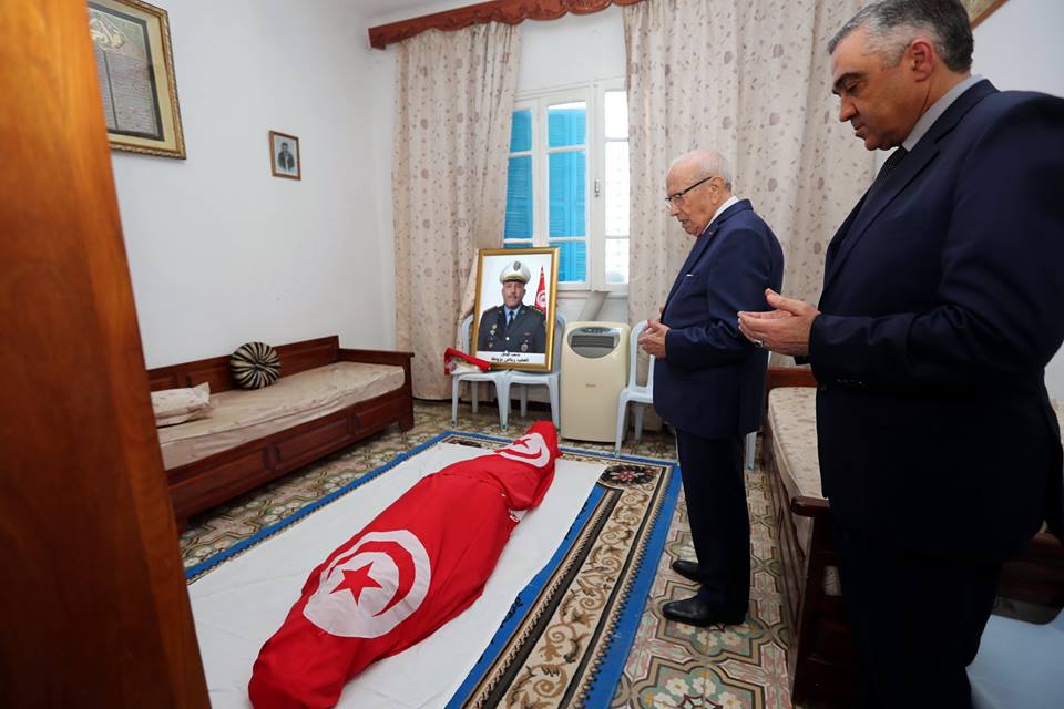 واستمع رئيس الدولة، الذي كان مصحوبا بوزير الداخلية لطفي براهم، الى مشاغل العائلة وزملاء الشهيد وممثلين عن النقابات الأمنيّة، مشدّدا على ضرورة تأمين كل الرعاية اللازمة اجتماعيا ومعنويا لكل عائلات جرحى وشهداء القوات الأمنية، مؤكدا حرصه على الإسراع بالمصادقة على قانون زجر الاعتداءات على القوات الحاملة للسلاح بعد مناقشته بمجلس نواب الشعب، لحفظ حقوق الأمنيين وتأمين الإحاطة الاجتماعية المتواصلة لهم ولعائلاتهم.