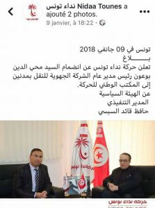اعلنت حركة نداء تونس يوم 09 جانفي 2018انضمام المدير العام للشركة الجهوية للنقل بمدنين محي الدين للمكتب الوطني للحركة.