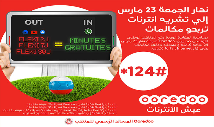تونسرياضة330 0 23 مارس، 201823 مارس، 2018 بمناسبة المباراة الودية التي ستجمع الفريق التونسي لكرة القدم بايران تهدي اوريدو ’المساند الرسمي للمنتخب الوطني’ لكل حرفائها دقائق مكالمات مجانية صالحة لمدة 24 ساعة لكل باقة انترنات يتم اقتنائها . و هذا العرض صالح ليوم 23 مارس 2018 .