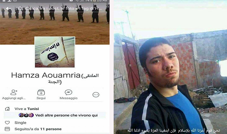 حيث تكشف الصفحة الرسمية لفايسبوك المعتدي حمزة عوامرية ان له فكر متطرف خاصة بدعوته الى الجهاد و بنشره لرايات داعش الارهابي .