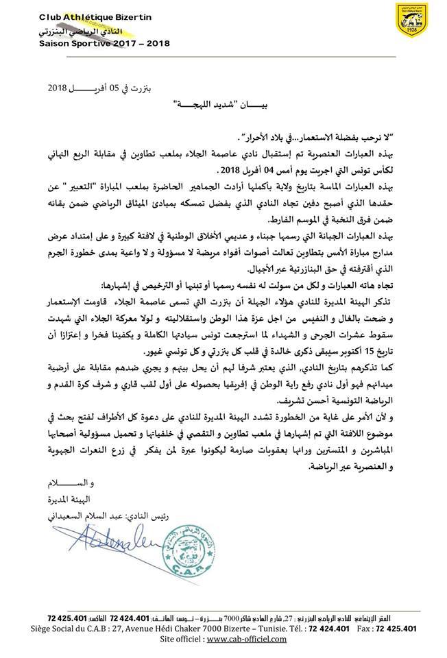 نددت الهيئة المديرة للنادي الرياضي البنزرتي برفع جماهير اتحاد تطاوين لافتة دٌوّن عليها ” لا نرحب بفضلة الاستعمار.. في بلاد الأحرار” خلال مباراة الربع النهائي لكأس تونس التي أجريت يوم 4 أفريل الجاري بملعب تطاوين.