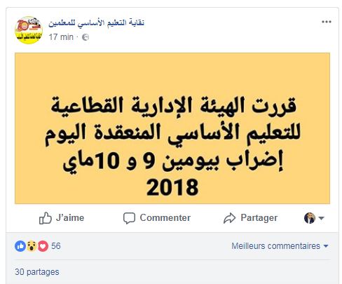 وأعلنت النقابة العامة للتعليم الأساسي عن هذا القرار في بلاغ مقتضب نشرته على صفحتها الرسمية بموقع الفايسبوك.