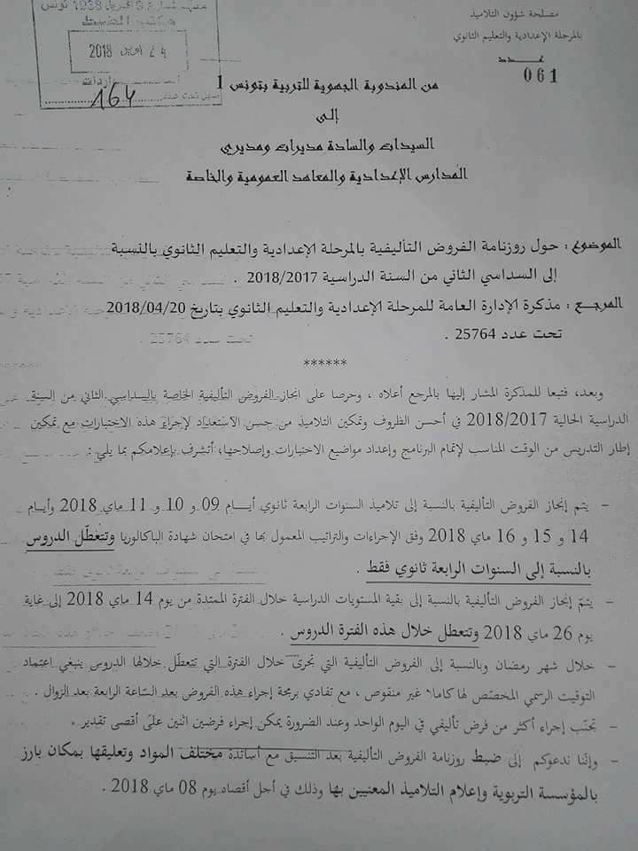 وجهت المندوبية الجهوية للتربية بتونس 1 منشورا الى مديرات ومديري المدارس الإعدادية والمعاهد العمومية والخاصة ويضبط روزنامة الفروض التأليفية بالنسبة الى السداسي الثاني من السنة الدراسية 2017/2018.
