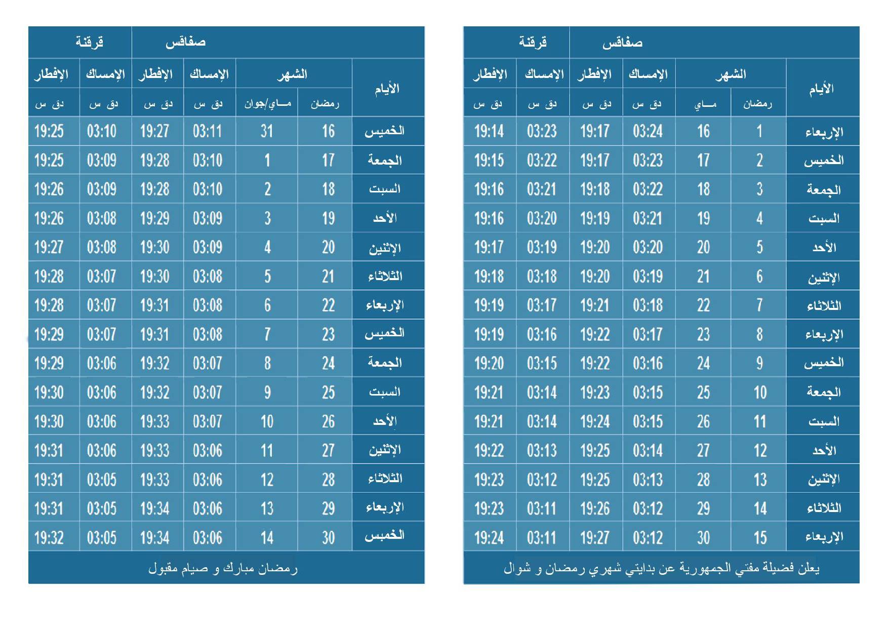 تونسمجتمع850 0 15 مايو، 201817 مايو، 2018 نشر المعهد الوطني للرصد الجوي، اليوم الثلاثاء، إمساكية شهر رمضان التي تتضمن أوقات الإمساك والإفطار. وفيما يلي امساكية رمضان: gafsa jendouba gabes bizerte beja mehdia kairouan kbeli kef kasserine tataouine sidi bouzid sfax mednine nabeul sousse zaghouan tozeur monastir seliana tunis