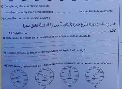 أكد أستاذ مادة الفيزياء بالمدرسة الاعدادية النموذجية بالقيروان ان الاية 125 من سورة الانعام التي ضمنها في فرض الفيزياء اثارت جدلا كبيرا وان البعض اولها انها تدعو للجهاد والبعض الاخر قال ان التلميذ الذي يحفظ الاية سيحصل على 4 نقاط اضافية في الفرض في جين استحسنها شق اخر.