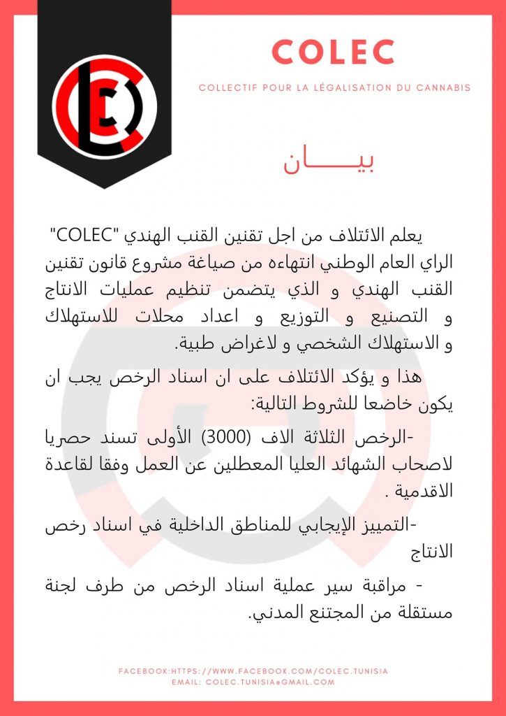 تونسمجتمع440 0 18 أبريل، 201918 أبريل، 2019 نشر الائتلاف من اجل تقنين القنب الهندي اليوم الخميس 18 أفريل 2019 على صفحته الرسمي على الفايسبوك بيانا حول شروط اسناد رخص الانتاج و البيع عند تقنين القنب الهندي وذلك على اثر انتهاءه من صياغة مشروع قانون تقنين الزطلة. نص البيان :