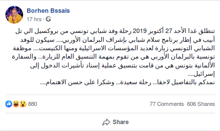 نبه الإعلامي والناشط السياسي السابق في تدوينةٍ نشرها على صفحته على الفايسبوك إلى ورود معلومات عن تحول وفد شبابي تونسي من بروكسيل إلى تل أبيب اليوم الأحد 27 أكتوبر وذلك ضمن “برنامج سلام شبابي بإشراف البرلمان الأوربي”.