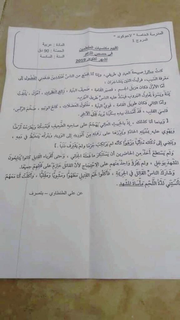 تداول أمس الاثنين 4 نوفمبر الجاري رواد الفايسبوك وثيقة إمتحان تقييمي لتلاميذ السنة السادسة بالمدرسة الخاصة الابتدائية “لاجوكوندا” بالمروج 1 بالضاحية الجنوبية للعاصمة، مقتطف من كتاب لعلي الطنطاوي وصف من المدافعين عن حقوق الطفل بجربمة ولا بد من عدم السكوت عليها والتصدي لذلك بكل قوة.