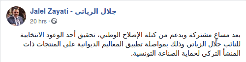 رحب النائب عن كتلة الاصلاح الوطني جلال الزياتي في تدوينةٍ نشرها على صفحته الرسمية على الفايسبوك بمصادقة البرلمان أمس الثلاثاء، على التمديد في تطبيق معاليم ديوانية إستثنائية على السلع التركية.