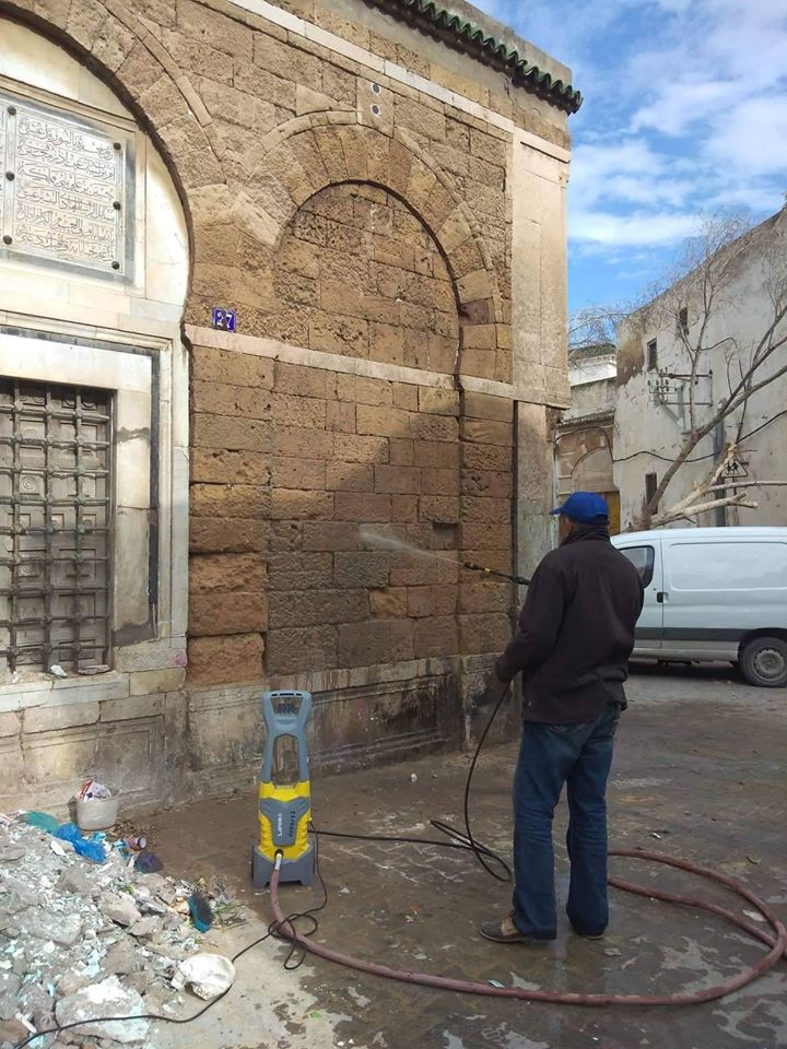 المعهد الوطني للتّراث يتدخّل لإزالة آثار الحُروق والرّواسب بالواجهات الخارجيّة لزاوية الفلاري بنهج تربة الباي بالمدينة العتيقة (صور)