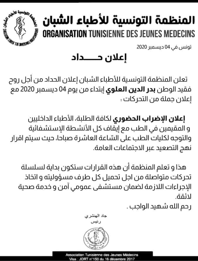 اعلنت المنظمة التونسية للأطباء الشبان اليوم الجمعة 04 ديسمبر 2020 في بيان لها الحداد من أجل روح فقيد الوطن بدر الدين العلوي مع جملة من التحركات.