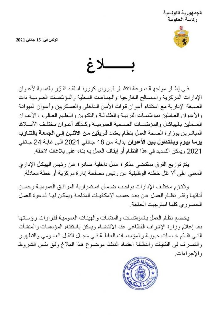 في بلاغ صادر عنها اليوم الجمعة 15 جانفي 2021، تعلم وزارة الوظيفة العمومية عن اعتماد نظام فريقين بالتناوب بداية من الاثنتين 18 جانفي الى الجمعة 24 جانفي 2021 مع امكانية التمديد في هذا النظام او ايقاف العمل بناء على بلاغات لاحفة.