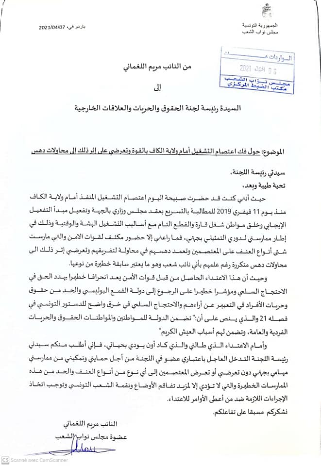 مريم اللغماني النائب عن جهة الكاف، تندد بهذا السلوك و تقوم اليوم بمراسلة هياكل المجلس من لجنة الحقوق والحريات و رئيس البرلمان كما تم اعلام رئاسة الجمهورية بذلك بما ان السيد رئيس الجمهورية هو الحامي للحقوق و الحريات و الضامن للدستور و حق الناس في التظاهر و الاعتصام، وفق قولها.