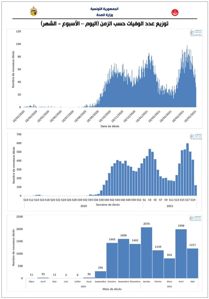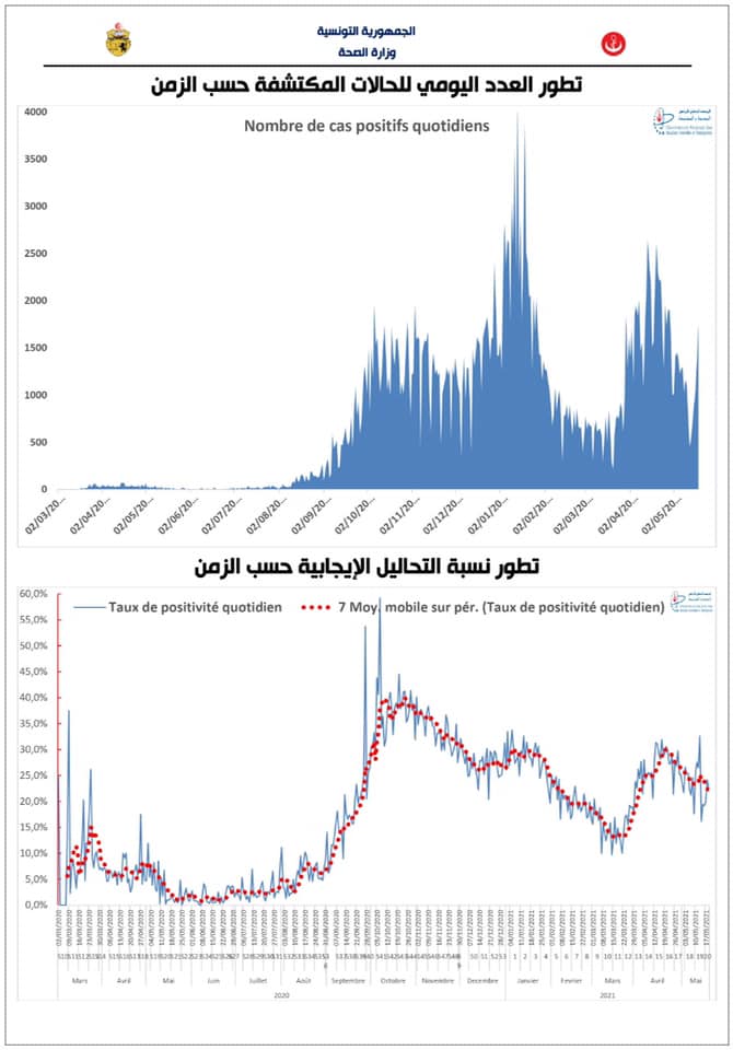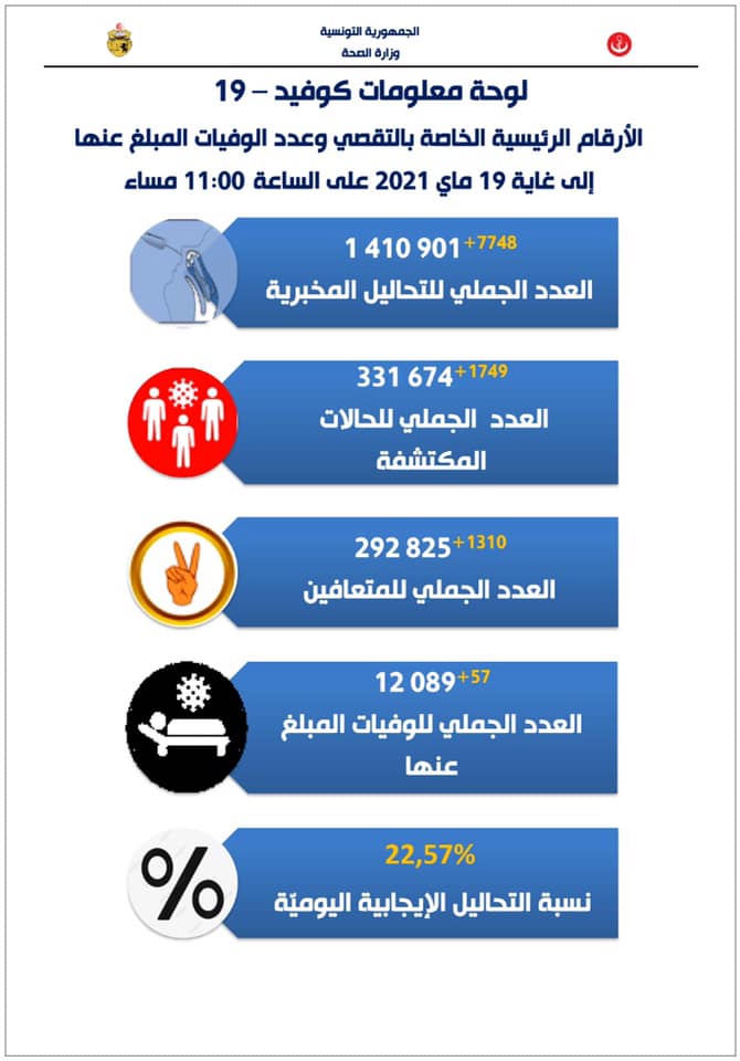 تونسمجتمع420 0 20 مايو، 202120 مايو، 2021 أعلنت وزارة الصحة مساء اليوم الخميس 20 ماي 2021 أنه بتاريخ أمس الاربعاء 19 ماي 2021 على الساعة الحادية عشر، تم تسجيل 1749 حالة اصابة جديدة. و تم تسجيل 57 حالة وفاة ليصبح العدد الجملي للوفايات 12089 والإصابات المكتشفة 331674 .
