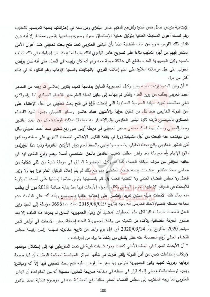 كما وعدت الاسبوع الماضي، و للضرورة القصوى لكشف الورم الخبيث في القضاء التونسي قضاء مريڨل و قضاء التعليمات و قضاء الكولوارات، و رغم ما يتعرض اعضاؤها للتهديدات، انطلقت هيئة الدفاع في نشر التقرير للتفقدية العامة اليوم الاثنين 5 جويلية 2021 و البداية مع ملف البشير العكرمي، رجل النهضة،