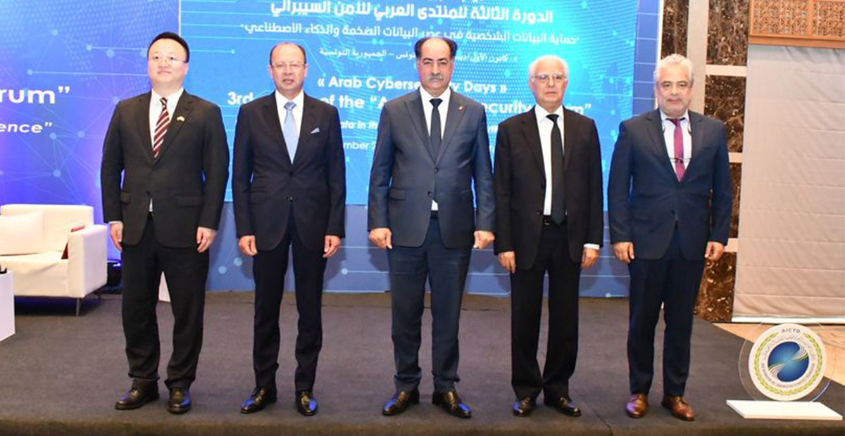 جانب من حفل الافتتاح الرسمي للمنتدى العربي للامن السيبراني – الدورة الثالثة- في الصورة بالترتيب من اليمين الى اليسار : - محمد الهادي حناشي رئيس سلطة ضبط البريد والاتصالات الالكترونية