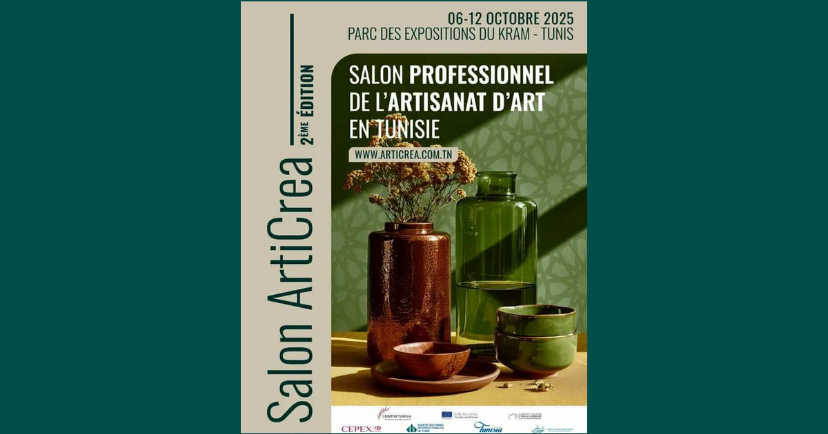 ينظم الديوان الوطني للصناعات التقليدية بالتعاون مع منظمة الأمم المتحدة للتنمية الصناعية في إطار مشروع CREATIVE TUNISIA الدورة الثانية للصالون المهني للصناعات التقليدية ARTICREA من 06 إلى 12 أكتوبر 2025 بقصر المعارض بالكرم.