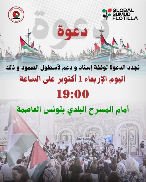 دعمًا لأسطول الصمود الذي يعدّ أمتاره الأخيرة للوصول إلى شواطئ غزة في مبادرة إنسانية تضامنية نضالية الأولى من نوعها عالميا، نعلن عن انطلاق تجمّع مساء اليوم إبتداءً من السّاعة 19:00 أمام المسرح البلدي بتونس العاصمة.