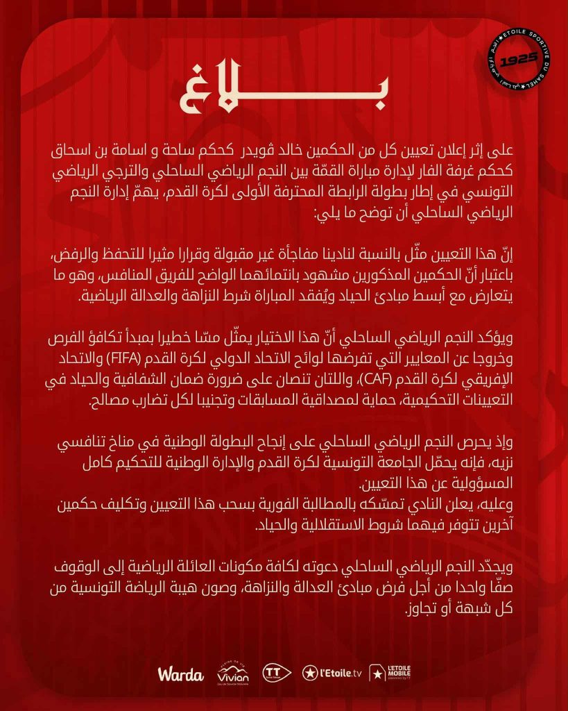 وإذ يحرص النجم الرياضي الساحلي على إنجاح البطولة الوطنية في مناخ تنافسي نزيه، فإنه يحمّل الجامعة التونسية لكرة القدم والإدارة الوطنية للتحكيم كامل المسؤولية عن هذا التعيين.