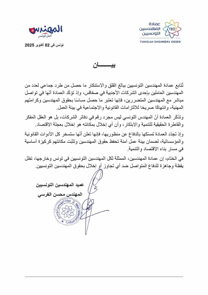 تُتابع عمادة المهندسين التونسيين ببالغ القلق والاستنكار ما حصل من طرد جماعي لعدد من المهندسين العاملين بإحدى الشركات الأجنبية في صفاقس، وإذ تؤكّد العمادة أنّها في تواصل مباشر مع المهندسين المتضررين، فإنها تعتبر ما حصل مساسًا بحقوق المهندسين وكرامتهم المهنية، وانتهاكًا صريحًا للالتزامات القانونية والاجتماعية في بيئة العمل.