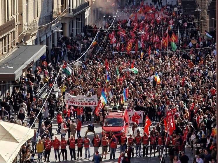 يقول مجدي الكرباعي الناشط في المجتمع المدني في عبر التدوينة التالية التي نشرها على صفحات التواصل الإجتماعي و وثقها بالصور ان مئات المظاهرات قد اجتاحت اليوم الجمعة 3 أكتوبر 2025 كل المدن الإيطالية حيث أعلنت النقابات الإضراب العام تنديدا بالاعتداء على أسطول الصمود لكسر الحصار على غزة واعتقال المشاركين السلميين و الانسانيين: