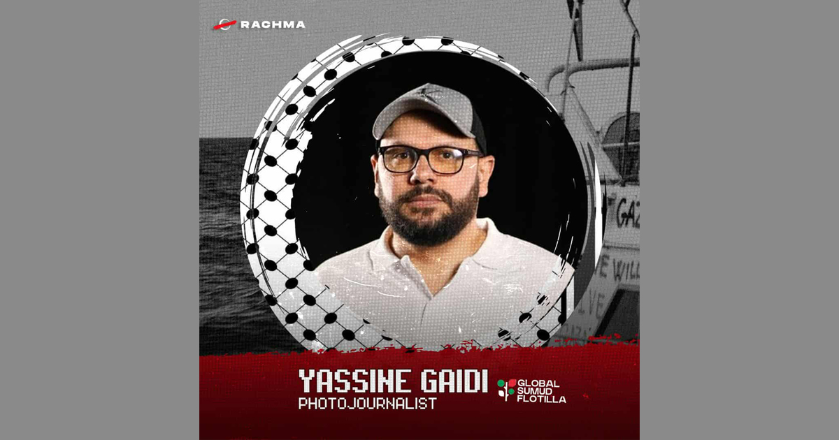 “جيش الاحتلال الإسرائيلي على المصوّر الصحفي المستقل ياسين قايدي، مراسل “رشمة” المكلّف بتغطية أسطول الصمود العالمي، والذي تعرّض للضرب وسوء المعاملة أثناء احتجازه.