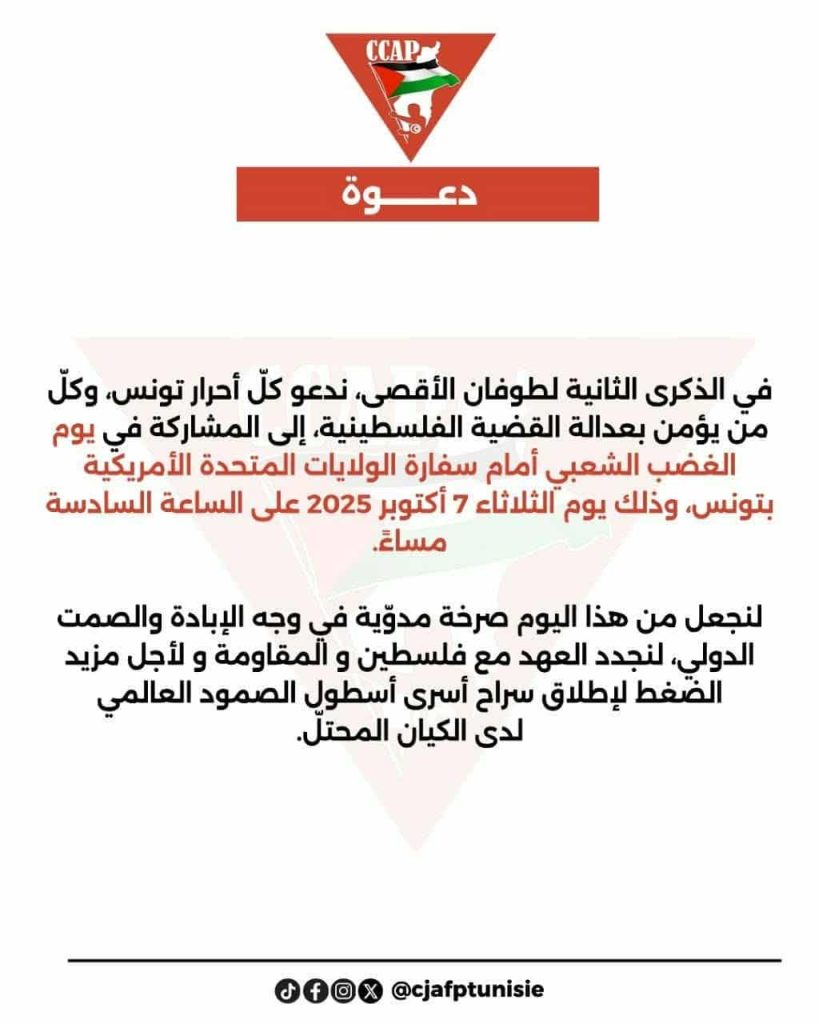 في الذكرى الثانية لطوفان الأقصى، ندعو كلّ أحرار تونس، وكلّ من يؤمن بعدالة القضية الفلسطينية، إلى المشاركة في يوم الغضب الشعبي أمام سفارة الولايات المتحدة الأمريكية بتونس، وذلك يوم الثلاثاء 7 أكتوبر 2025 على الساعة السادسة مساءً.