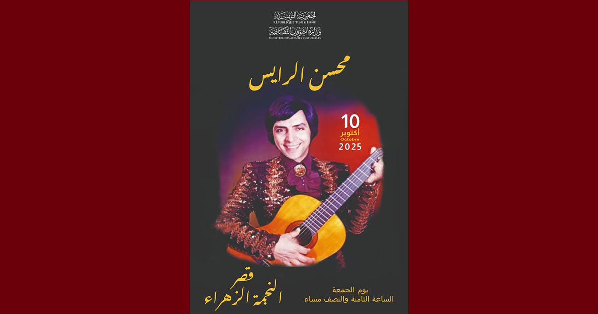 في إطار سعيها الدائم إلى تكريم رموز الأغنية التونسية وإحياء الذاكرة الفنية الوطنية، تنظّم وزارة الشؤون الثقافية أمسية موسيقية يؤثثها الفنان محسن الرايس، وذلك يوم الجمعة 10 أكتوبر 2025 بداية من الساعة الثامنة والنصف مساءً بـقصر النجمة الزهراء بسيدي بوسعيد.