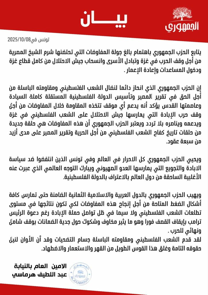 نص البيان/ يتابع الحزب الجمهوري باهتمام بالغ جولة المفاوضات التي تحتضنها شرم الشيخ المصرية من أجل وقف الحرب في غزة وتبادل الأسرى وانسحاب جيش الاحتلال من كامل قطاع غزة ودخول المساعدات وإعادة الإعمار .