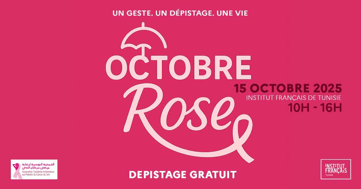 فحص سريع ومجاني لسرطان الثدي، يُجريه متخصصون في الرعاية الصحية، مع احترام تامّ لخصوصية كل مواطنة و سيكون الموعد يوم 15 أكتوبر من الساعة 10 صباحًا إلى 4 مساءً في المعهد الفرنسي بتونس و ذلك بالتعاون مع الجمعية التونسية لرعاية مرضى سرطان الثدي.