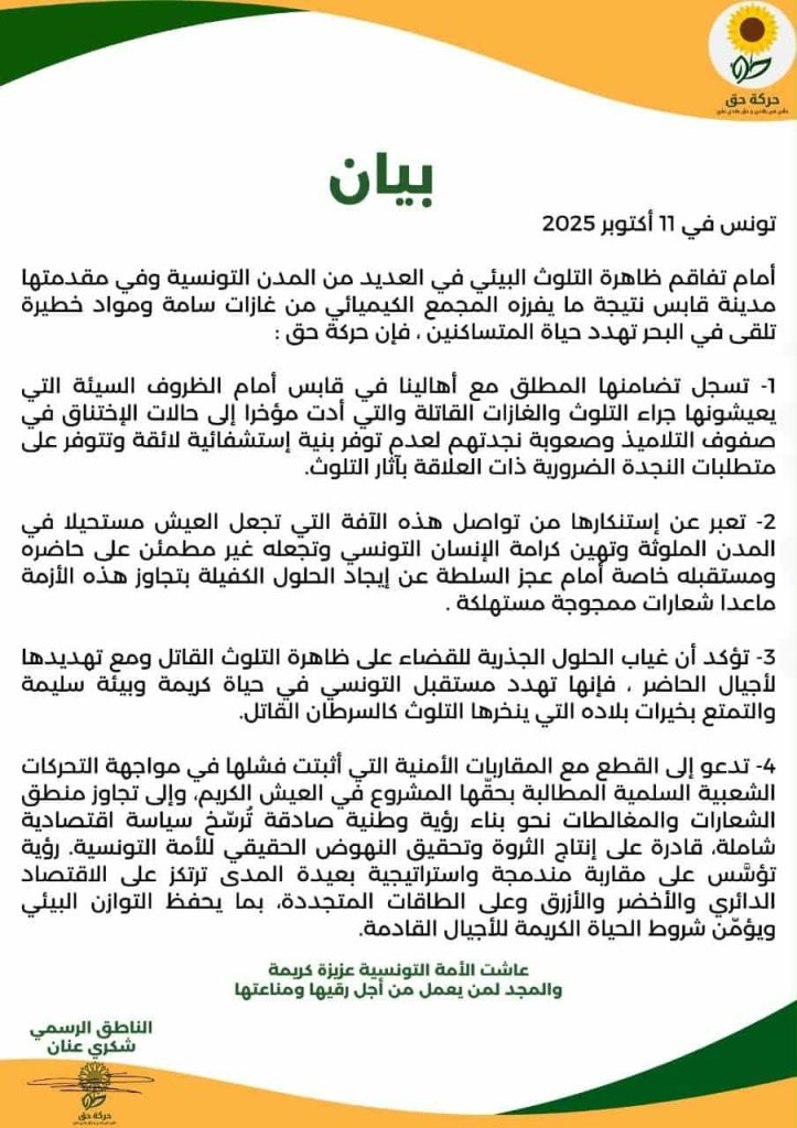 أمام تفاقم ظاهرة التلوث البيئي في العديد من المدن التونسية وفي مقدمتها مدينة قابس نتيجة ما يفرزه المجمع الكيميائي من غازات سامة ومواد خطيرة تلقى في البحر تهدد حياة المتساكنين ، فإن حركة حق :