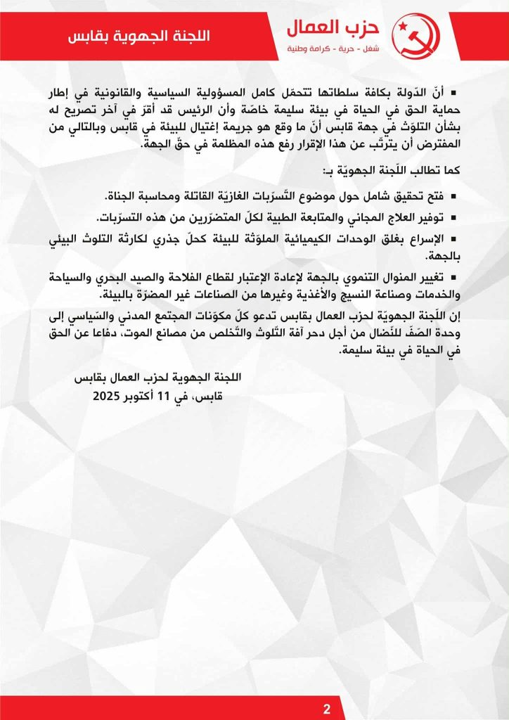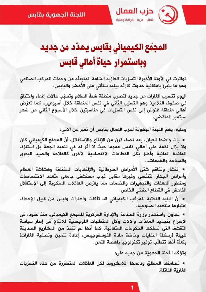 إن اللّجنة الجهويّة لحزب العمال بقابس تدعو كلّ مكوّنات المجتمع المدني والسّياسي إلى وحدة الصّفّ للنّضال من أجل دحر آفة التّلوث والتّخلص من مصانع الموت، دفاعا عن الحق في الحياة في بيئة سليمة.