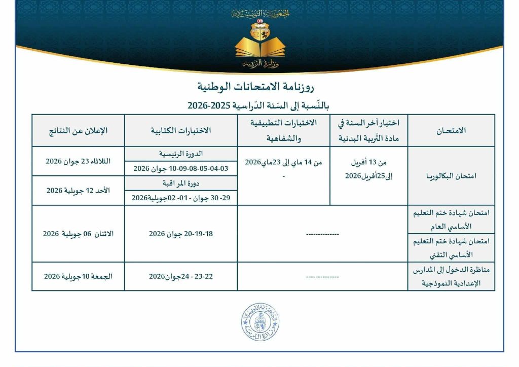 *وبخصوص امتحان شهادة ختم التعليم الأساسي العام والتقني فسينتظم أيام 18 و19 و20 جوان على ان يتم الإعلان عن النتائج يوم 6 جويلية 2026.