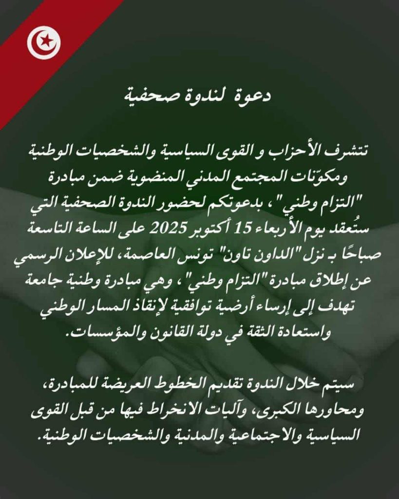“التزام وطني “، بدعوتكم لحضور الندوة الصحفية التي ستُعقد يوم الأربعاء 15 أكتوبر 2025 على الساعة التاسعة صباحًا بـ نزل “الداون تاون” تونس العاصمة، للإعلان الرسمي عن إطلاق مبادرة “التزام وطني”، وهي مبادرة وطنية جامعة تهدف إلى إرساء أرضية توافقية لإنقاذ المسار الوطني واستعادة الثقة في دولة القانون والمؤسسات.