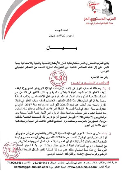 نص البيان/ يتابع الحزب الدستوري الحر بإهتمام شديد تطوّر الأوضاع الصحية والبيئية والإجتماعية بجهة قابس على إثر تفاقم المخاطر الناتجة عن التسرّبات الغازيّة السامة من المجمّع الكيميائي التونسي،