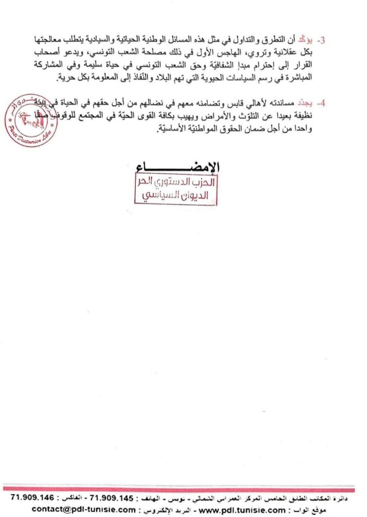 3- يؤكّد أن التطرق والتداول في مثل هذه المسائل الوطنية الحياتية والسيادية يتطلب معالجتها بكل عقلانية وتروي، الهاجس الأول في ذلك مصلحة الشعب التونسي، ويدعو أصحاب القرار إلى إحترام مبدإ الشفافيّة وحق الشعب التونسي في حياة سليمة وفي المشاركة المباشرة في رسم السياسات الحيوية التي تهم البلاد والنّفاذ إلى المعلومة بكل حرية.