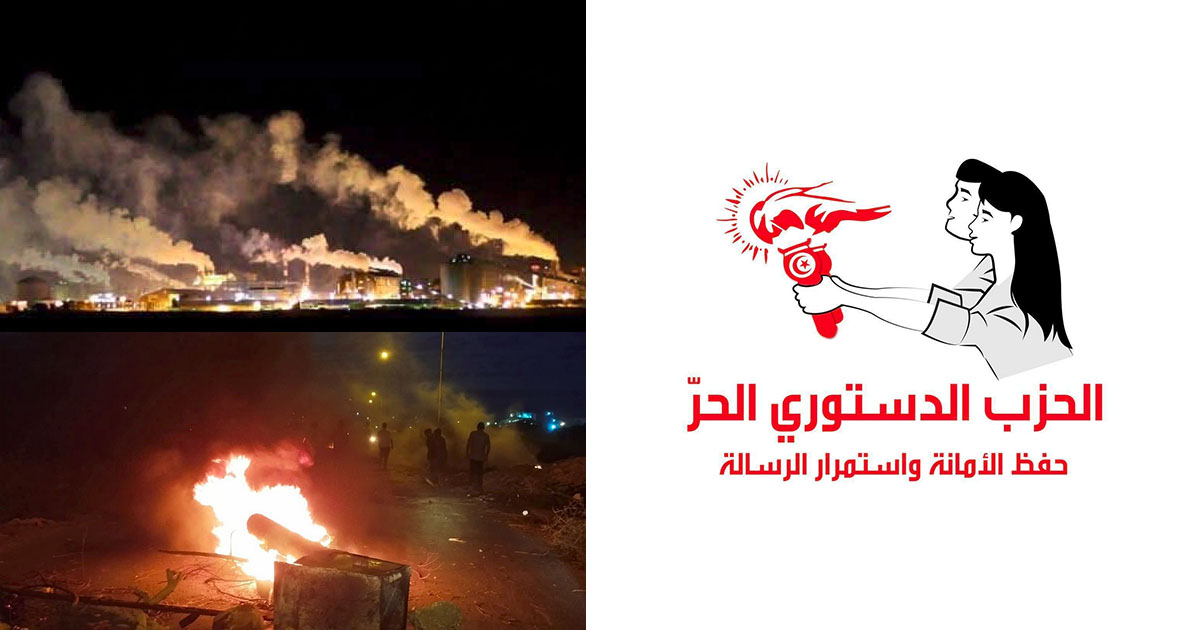 نص البيان/ يتابع الحزب الدستوري الحر بإهتمام شديد تطوّر الأوضاع الصحية والبيئية والإجتماعية بجهة قابس على إثر تفاقم المخاطر الناتجة عن التسرّبات الغازيّة السامة من المجمّع الكيميائي التونسي،