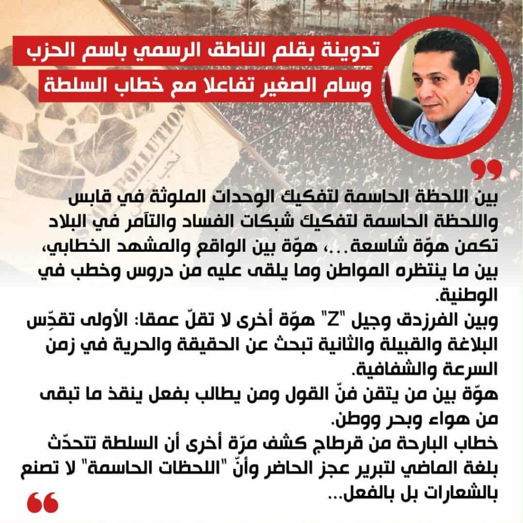في التدوينة التي نشرها اليوم على حسابه الرسمي بصفحات التواصل الاجتماعي بالفايسبوك و تداولها الموقع الرسمي للجمهوري، علق وسام الصغير، الناطق الرسمي للحزب بما يلي على خطاب الرئيس سعيد بخصوص مسيرات قابس احتجاجا على السموم التي تبثها وحدات المجمع الكيميائي متسببة في أمراض خطيرة تضر بصحة الانسان و في كوارث بيئية في البحر و الأرض: