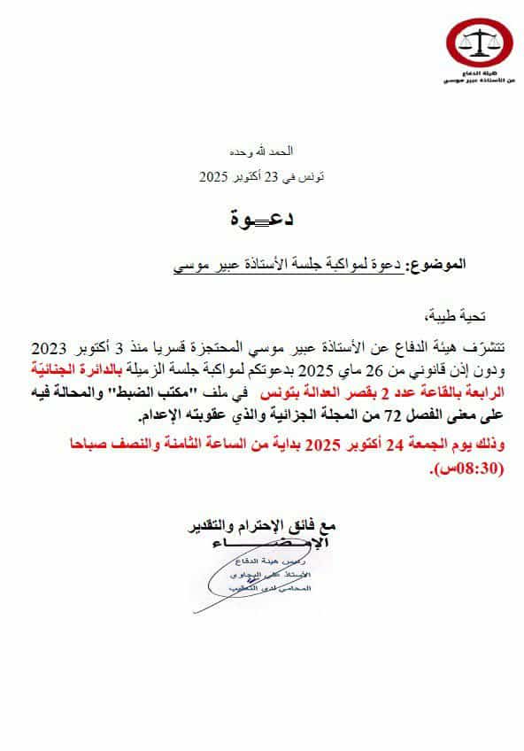 تمثل الأستاذة عبير موسي في السجن منذ اكثر من سنتين يوم الجمعة 24 أكتوبر 2025 في الدائرة الجنائية الرابعة باستئناف تونس لمحاكمتها في القضية المعروفة اعلاميا بملف مكتب الضبط برئاسة الجمهورية وفق الفصل 72 في جريمة لم تقترفها و عقوبتها الإعدام و أمام محكمة مطعون في شرعيتها قانونيا، وفق ما نشره الأستاذ العريبي عضو هيئة الدفاع عن زميلته و ذلك على حسابه الخاص بصفحات التواصل الإجتماعي بالفايسبوك و الذي جاء كما يلي: