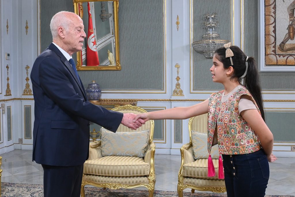وأعرب رئيس الدّولة، في مستهلّ هذا اللّقاء، عن اعتزازه واعتزاز كلّ التونسيّين والتونسيّات بهذا التّتويج مُقدّمًا أحرّ تهانيه للفائزتين اللّتين أبهرتا لا الحضور فقط بل انتشر صدى تصريحاتهما المتميّزة بحسن بنائها وعذوبة ألفاظها في أنحاء العالم. فقد اجتمع في هذه التّصريحات التي أدلتا بها، وسنّهما لم يتجاوز العقد الأوّل إلاّ بسنتين اثنتين، التّسلسل والسّلاسة وعمق الفكر وفصاحة القول وبلاغته باللّغة العربية، لغة القرآن الكريم، لغة الضادّ التي قِيل عنها أنّها بُنِيت على أصل يجعل شبابها خالدًا فلا تَهْرم ولا تمُوت.