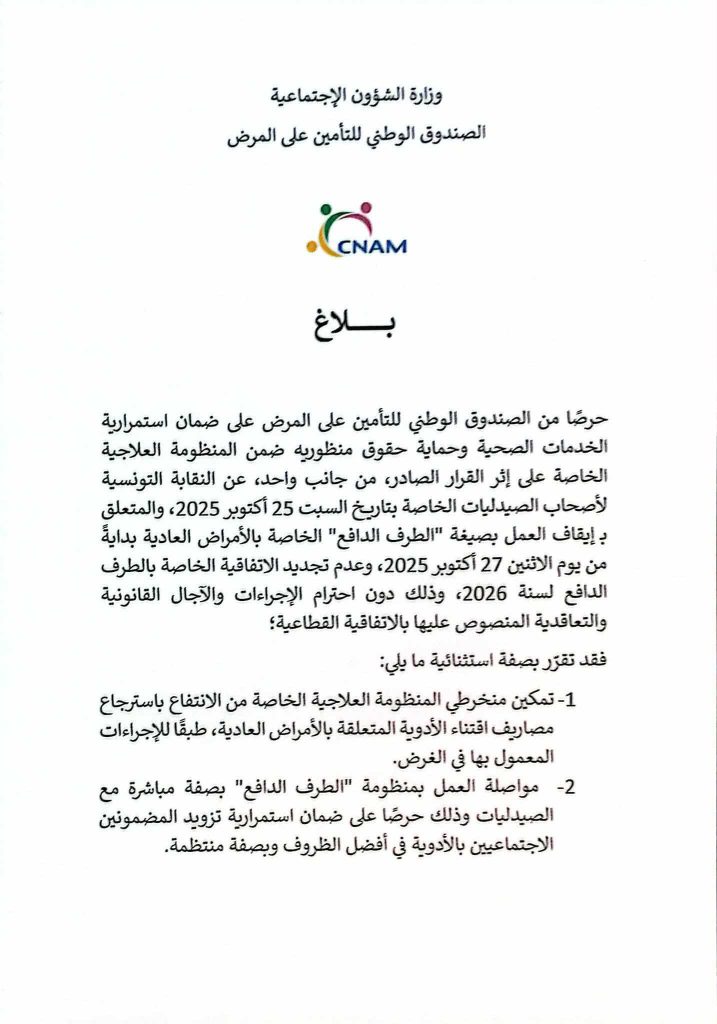 “حرصًا من الصندوق الوطني للتأمين على المرض على ضمان استمرارية الخدمات الصحية وحماية حقوق منظوريه ضمن المنظومة العلاجية الخاصة على إثر القرار الصادر، من جانب واحد، عن النقابة التونسية لأصحاب الصيدليات الخاصة بتاريخ السبت 25 أكتوبر 2025، والمتعلق بـ إيقاف العمل بصيغة “الطرف الدافع” الخاصة بالأمراض العادية بدايةً من يوم الاثنين 27 أكتوبر 2025، وعدم تجديد الاتفاقية الخاصة بالطرف الدافع لسنة 2026، وذلك دون احترام الإجراءات والآجال القانونية والتعاقدية المنصوص عليها بالاتفاقية القطاعية؛