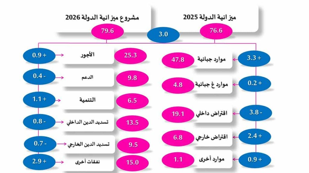 - ميزانية الدولة لسنة 2026 تقدّر بحوالي 79.6 مليار دينار أي بزيادة 3 مليار دينار مقارنة بميزانية الدولة لسنة 2025 (76.6 مليار دينار).