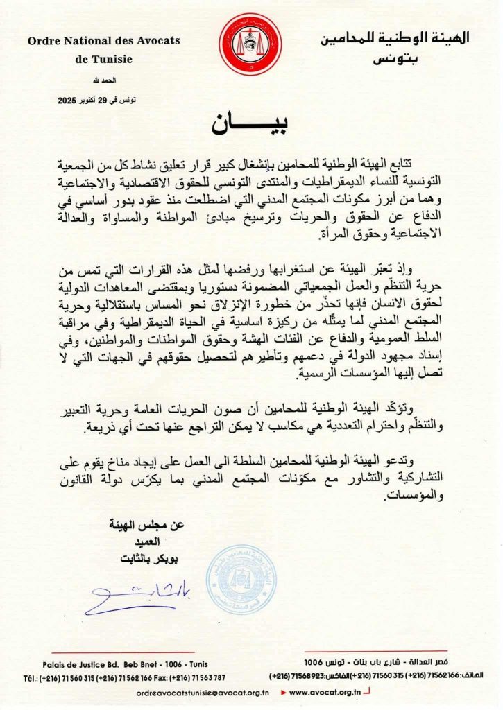 عبّرت الهيئة الوطنية للمحامين بتونس في بيان لها اليوم الأربعاء 29 أكتوبر عن مدى استغرابها ورفضها لقراري تجميد نشاط كل من جمعية النساء الديمقراطيات ومنتدى الحقوق و الحريات.