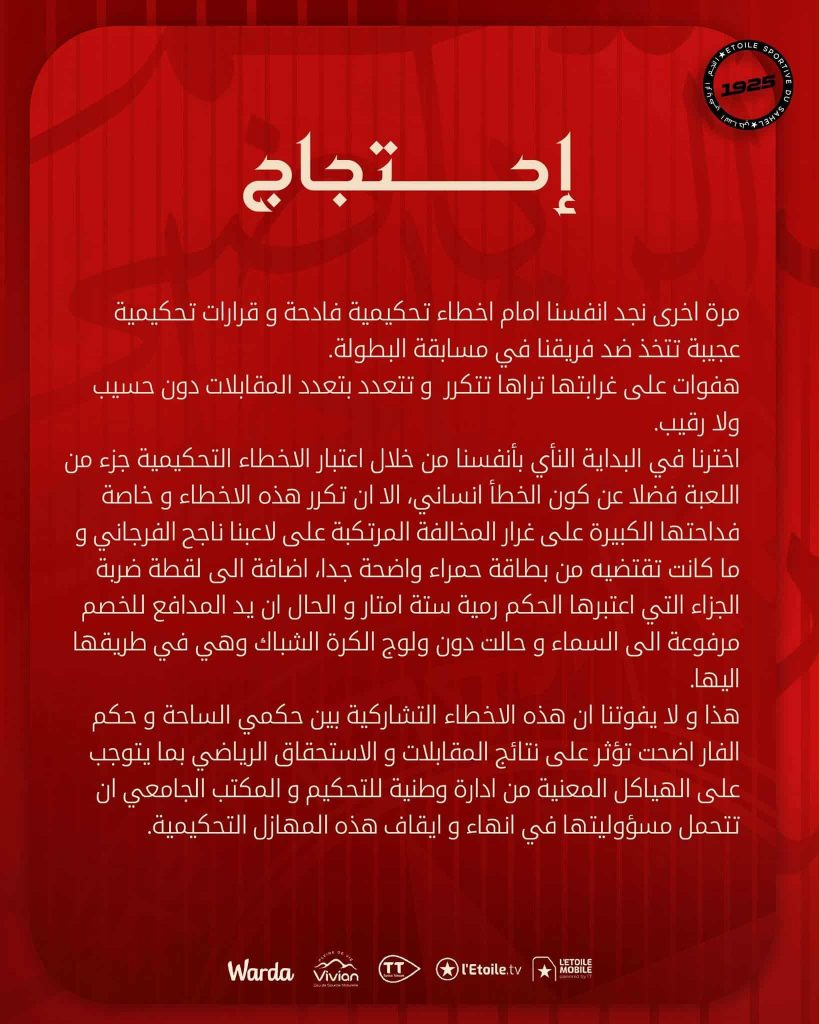 أصدرت الهيئة المديرة للنجم الرياضي الساحلي مساء اليوم الأربعاء 29 أكتوبر الاحتجاج التالي: