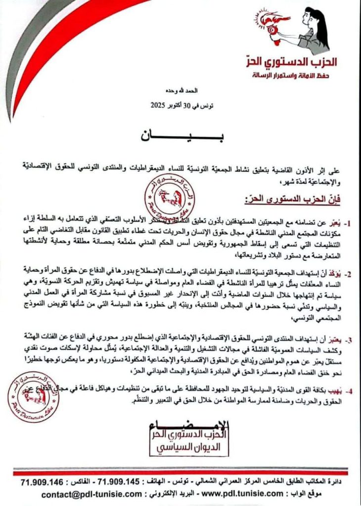 على إثر الأذون القاضية بتعليق نشاط الجمعيّة التونسيّة للنساء الديمقراطيات والمنتدى التونسي للحقوق الإقتصاديّة والإجتماعيّة لمدّة شهر،
